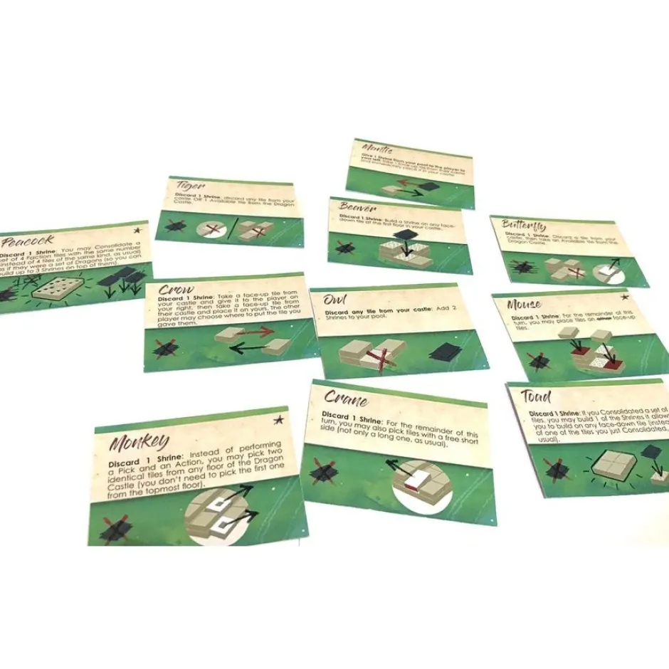 Varje Gang Du Skapar En Uppsattning Brickor Av Samma Slag ”Konsoliderar Du” Dem, Dvs Vand Dem Med Framsidan Nedat For Att Fa Poang. Nar Du Konsoliderar En Uppsattning Kan Du Ocksa Bygga Helgedomar Ovanpa De Konsoliderade Brickorna: Helgedomar Later Dig Fa Fler Poang, Men De Begransar Ocksa Dina Byggalternativ. Du Kan Ocksa Dra Nytta Av Det Tillgangliga Andekortet Och Dess Spelforandrande Krafter… Men Det Kostar! Slutligen, Glom Inte Att Kontrollera Drakkortet Och Att Folja Byggnadskraven For Att Fa Bonuspoang.