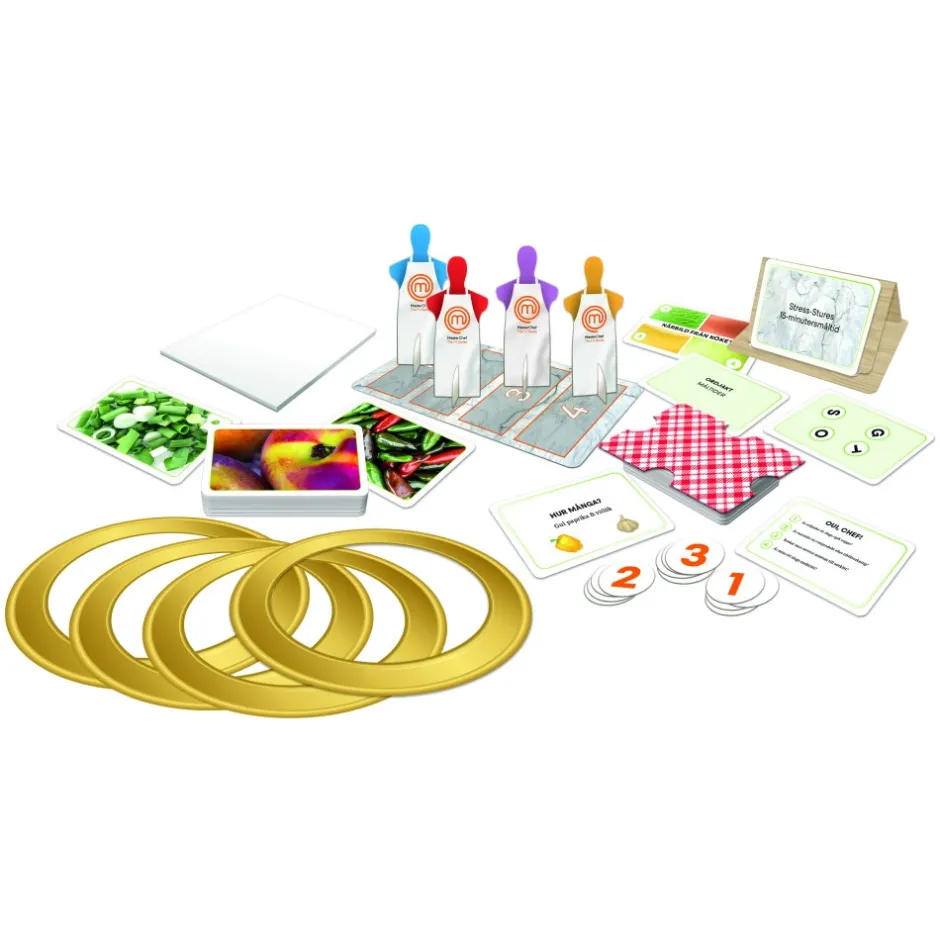 150 Kort, Poangtavla, 4 Figurer Med Masterkocksforkladen, 4 Papptallrikar, 12 Poangbrickor, 1 Korthallare, 1 Duk-Kort, 1 Tomt Anteckningsblock, Regler